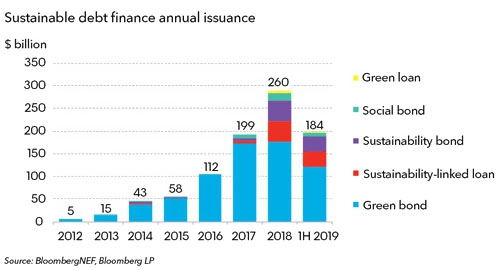 本年上半年,全球可繼續債款融資體現搶眼,創下新的紀錄,到達1840億美元,包含綠色債券,綠色借款,可繼續借款等。一般來說,上半年的體現比下半年安靜。所以,即便2019年終究六個月的發行利率堅持不變,估計全年至少可以獲得3800億美元的可繼續債款融資,2018年全球可繼續債款融資達2600億美元。
